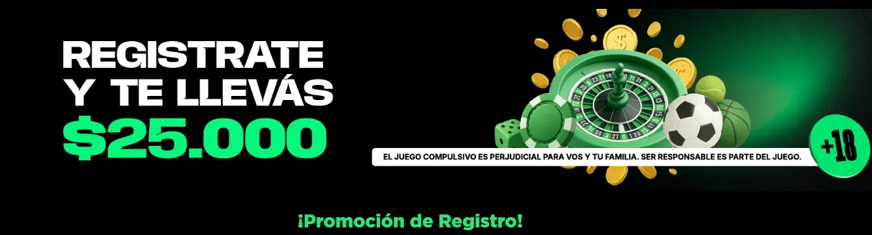 Valor del bonoBono por registro de $25,000 ARS + 20 giros gratisDuplicá el primer depósito hasta $350.000